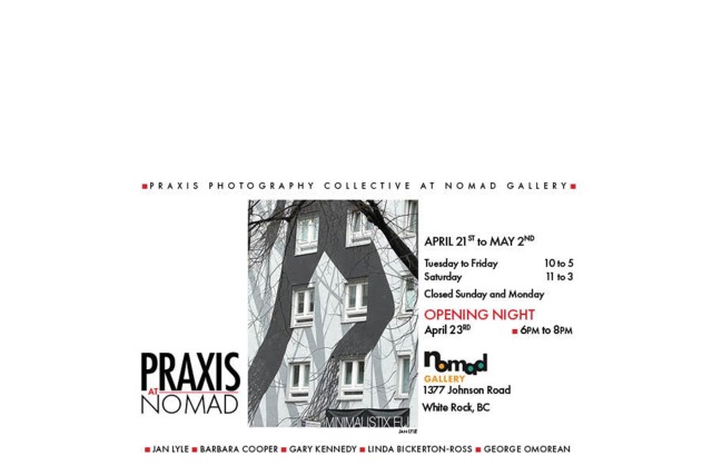 Join the Praxis Photography Collective for an Artist Talk and Gallery Tour at their eighth collaborative exhibition, Praxis at Nomad. Meet the artists, hear the stories behind the work, and explore a mix of photo-based techniques and takeaways—from photo encaustic and street photography to iPhone hacks and presentation tips. The session includes a hands-on demonstration. Members of the collective are: Linda Bickerton-Ross, Barbara Cooper, Gary Kennedy, Jan Lyle and George Omorean.