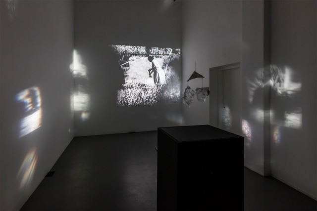 Tania Willard, Only Available Light (installation view), 2016, archival film (Harlan I. Smith, The Shuswap Indians of British Columbia, 1928, 8:44 min.), projector, quartz crystals and photons, dimensions variable, original composition by Leela Gilday. Courtesy of The Blackwood, University of Toronto, Mississauga. Photo: Toni Hafkenscheid.