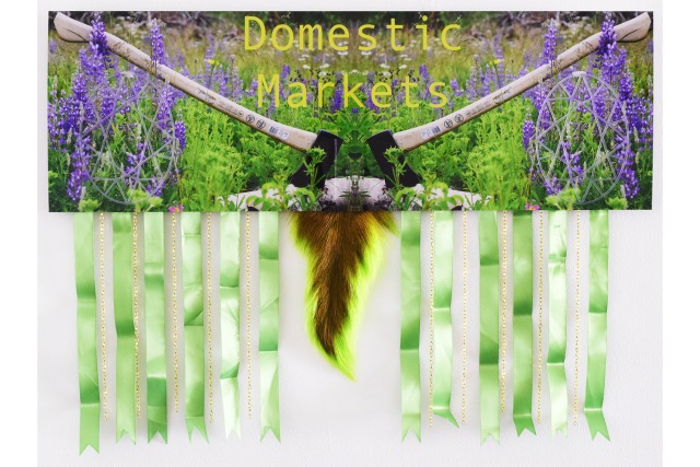 Tania Willard, Domestic Markets, from the Snowbank and Other Investments (2020-ongoing) series, 2021, archival inkjet print, Plexiglas, dyed white tailed deer tail, ribbon and chain, 59.6 x 81.2 cm. Collection of Jeffrey Boone and David Wong.