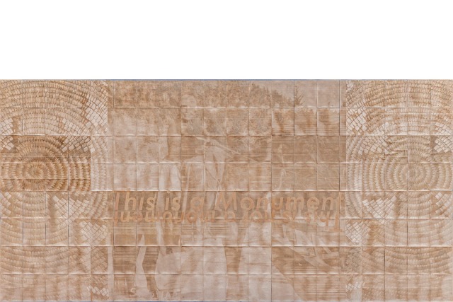 Tania Willard, Vestige, 2022, laser etching on garnet sandpaper (160 sheets), copper nails (640), 223.5 x 457.2 cm. Forge Project Collection, Traditional Lands of the Moh-He-Con-Nuck.